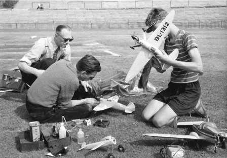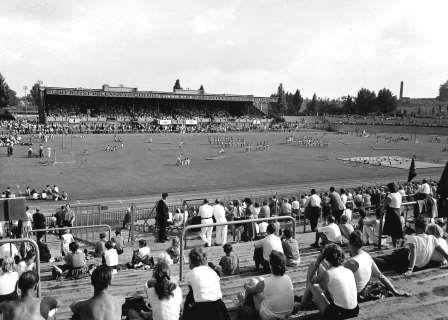 Das Poststadion nutzen schon in den 1950er Jahren nicht nur Fußballer: Hier zu sehen die Fesselflugmeisterschaften im Poststadion am 4. September 1954.