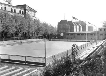 Schon 1955 wird am Eingang des Poststadions eine beleuchtete Rollsportanlage mit Tribüne gebaut.