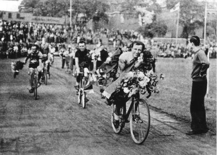 Die Internationale Deutschlandrundtour war ein Radsport-Etappenrennen, das vom 9. bis 25. Juni 1938 ausgetragen wurde. Hier dreht der damalige Siegers Hermann Schild im Poststadion seine Ehrenrunde.